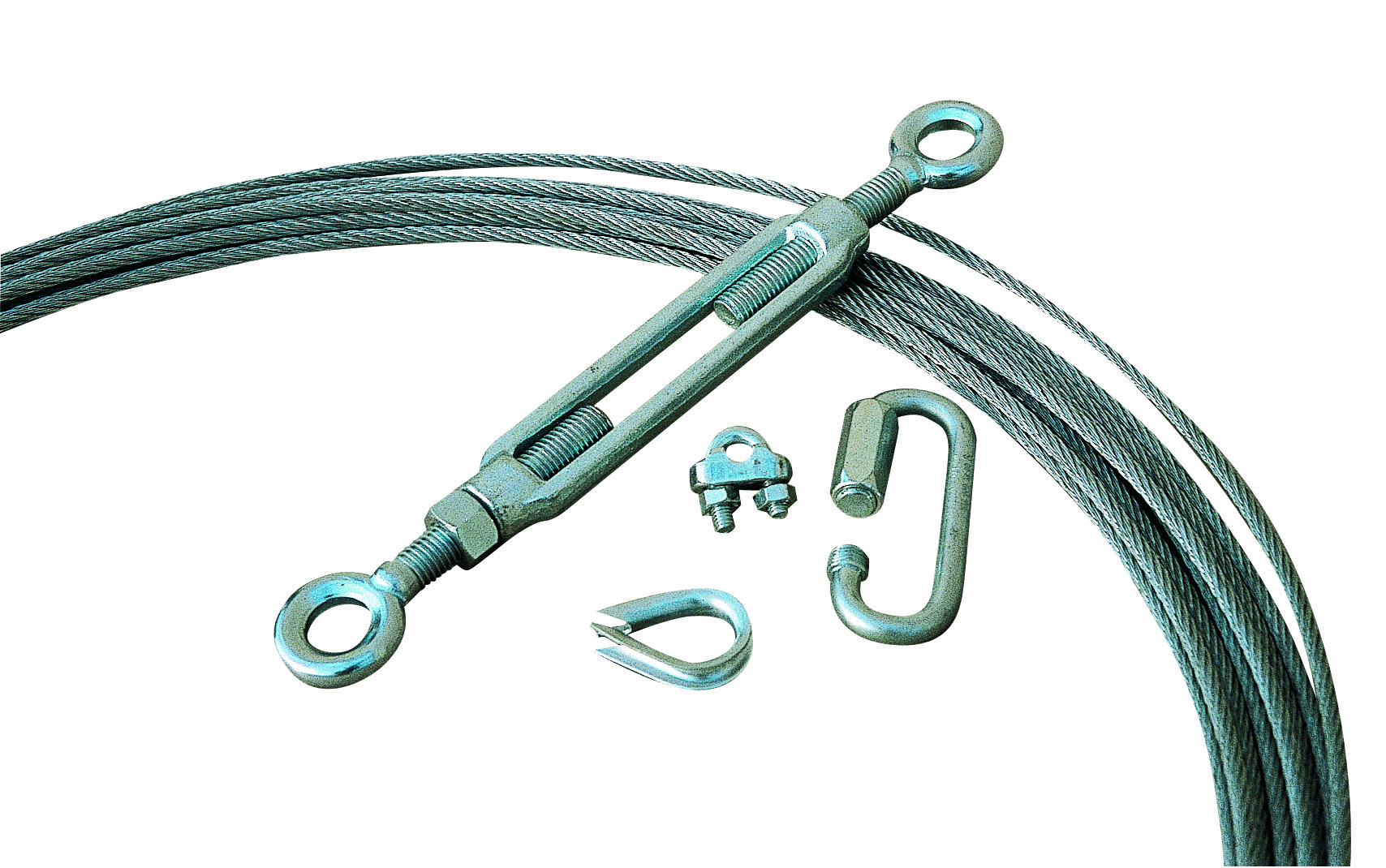 Set of 8 wire-strainer (B3027), 54 clamps (3 for each end D1752), 18 thimbles (B3023), 8 quick links (B3024).