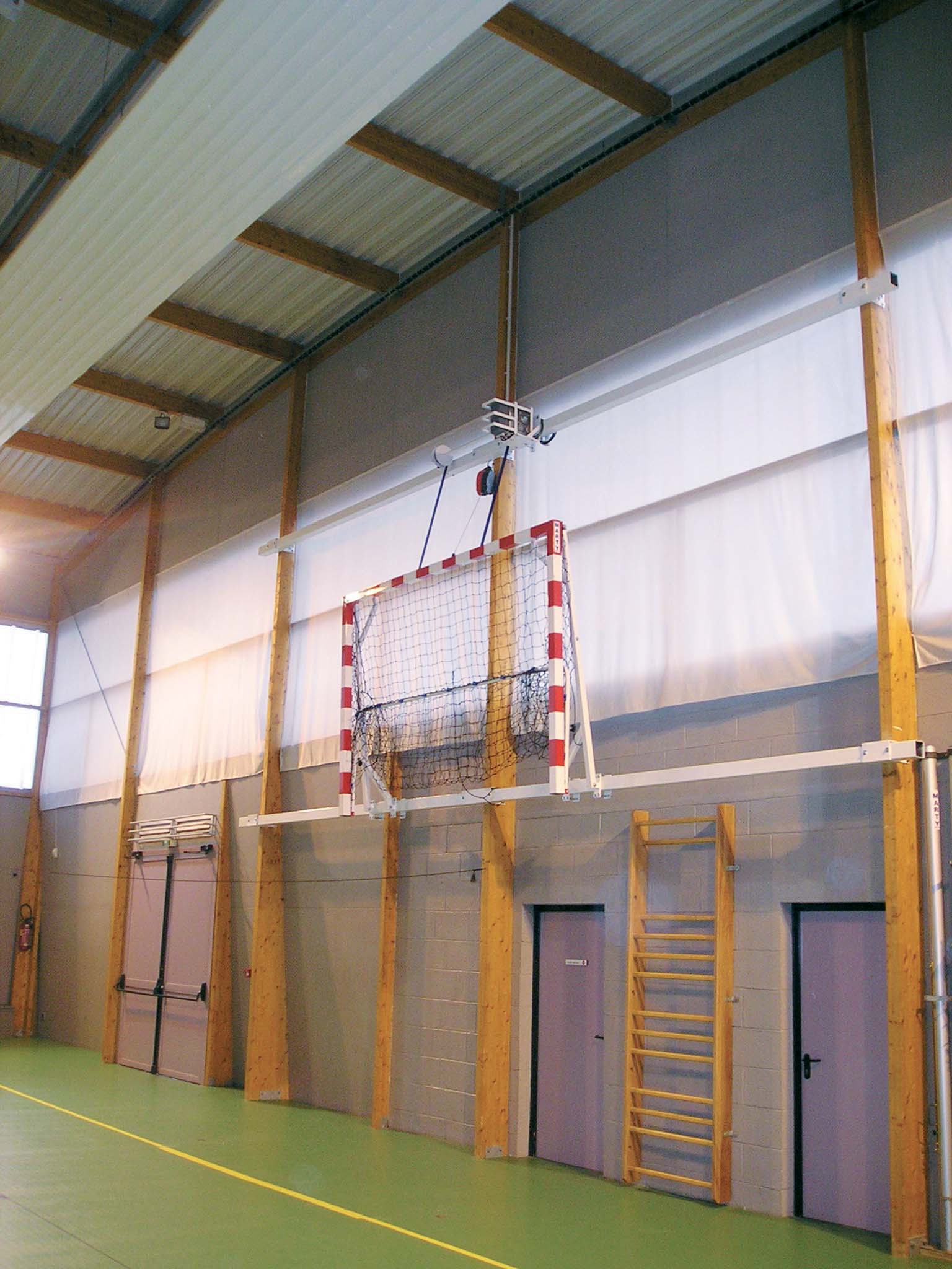 With electrical winder system similar to the one used for our basketball goals (B3017B)mounted on an axis with 2 winding pulleys and straps.