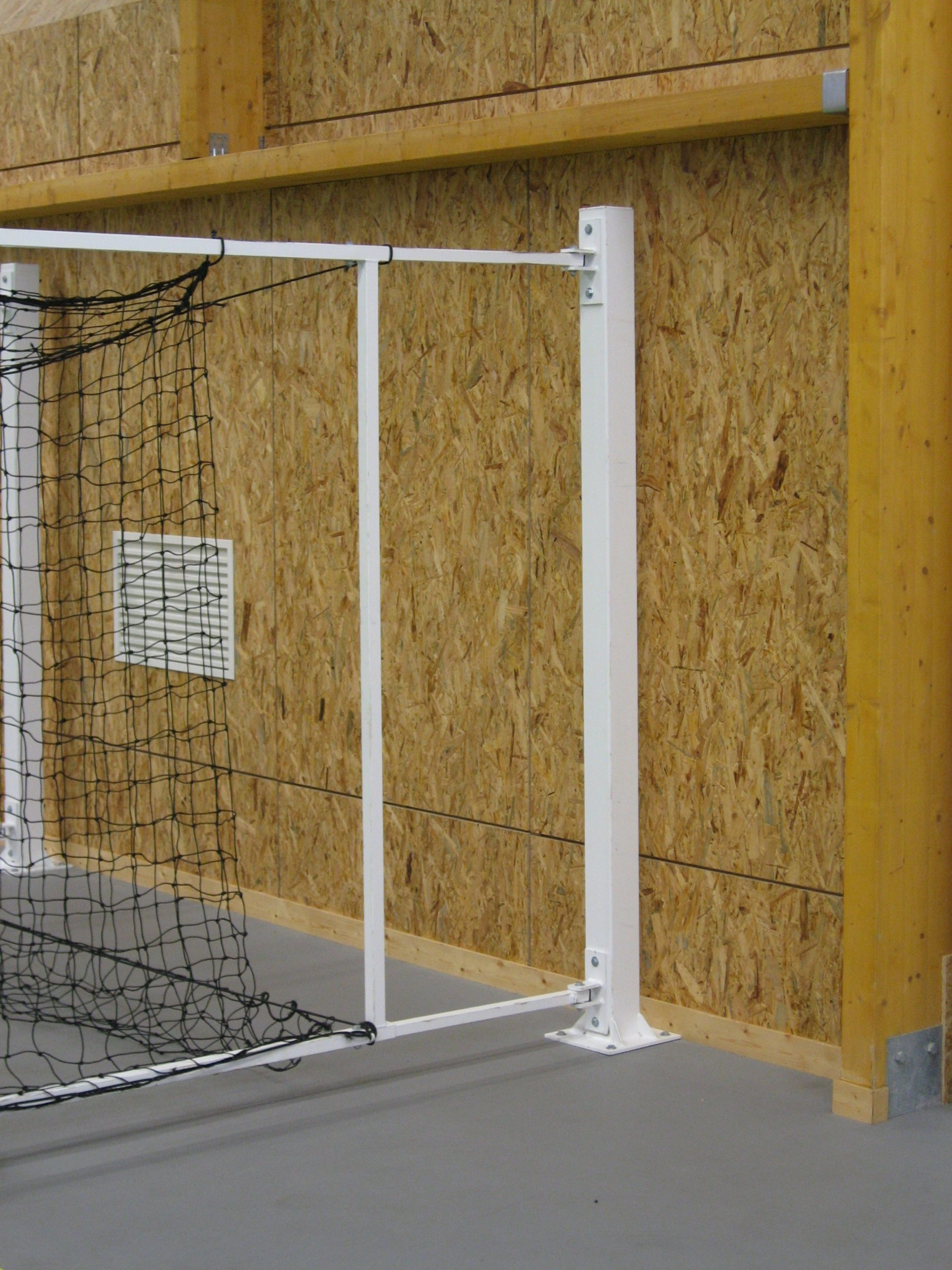 Useful for the foldable goals when the fixation is not possible directly on the wall. Metallic. Vertical frame on plate to seal to the ground.
