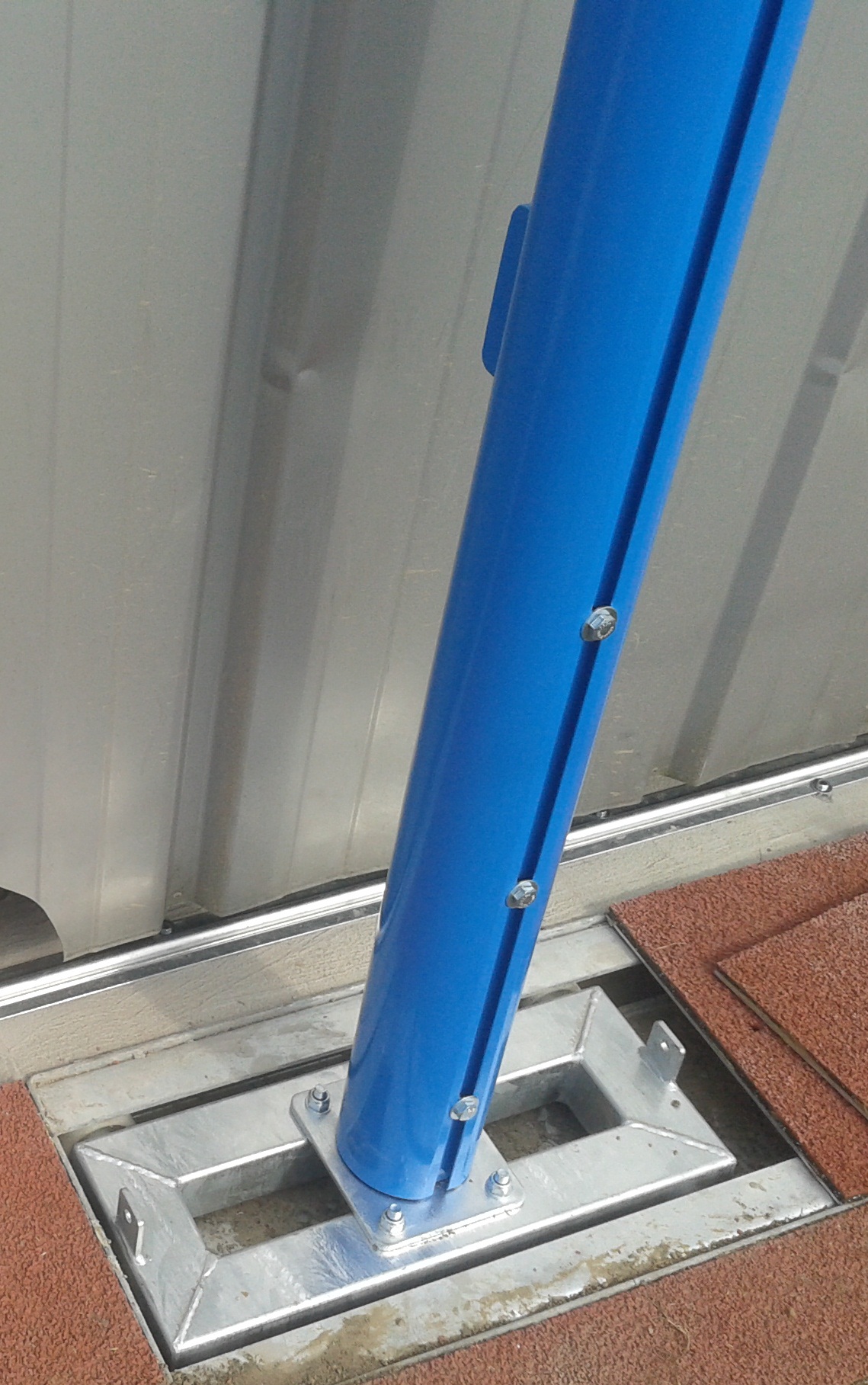 Crossbar support height adjustment mounted on gallows integrated to the post in wide groove with self-lubricating castors and pads.