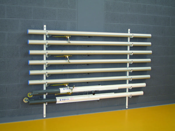 Métallique à fixer au mur. Pour 4 paires de poteaux de volley ou de tennis- Avec 8 berceaux recouverts PVC antifrottements- L’unité