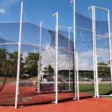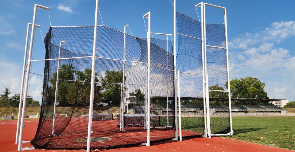 Cage de lancer de marteau : Une structure en aluminium (peint blanc) alliant robustesse extrême et esthétisme. ⚡