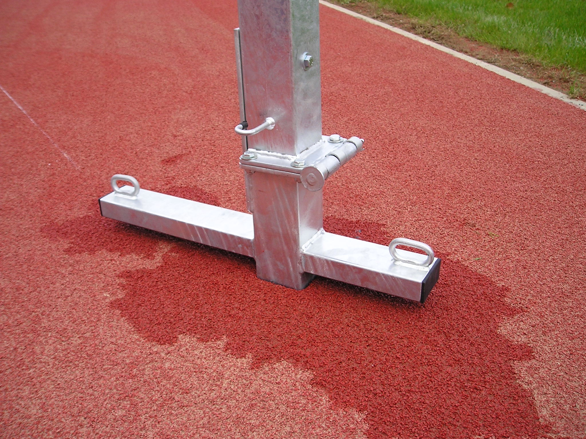 7 Poteaux ALUMINIUM RENFORCÉ équipés d’EMBASES BREVETE N°0312903 permettant de monter une cage disque à une seule personne.