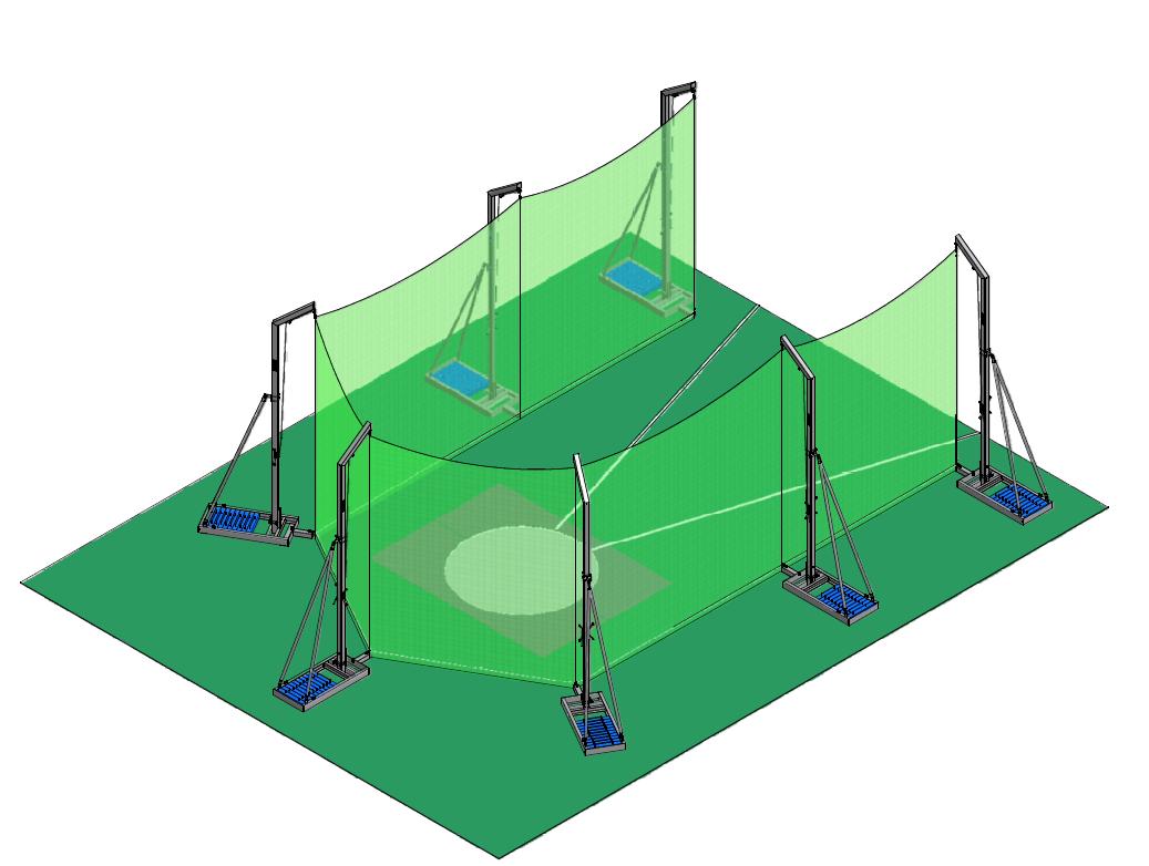 A POSER SANS SCELLEMENT – 7 poteaux hors sol 4m50 avec socles métalliques lestés de 500 kg. 1 filet intérieur maille 40mm épaisseur 4mm L’ensemble