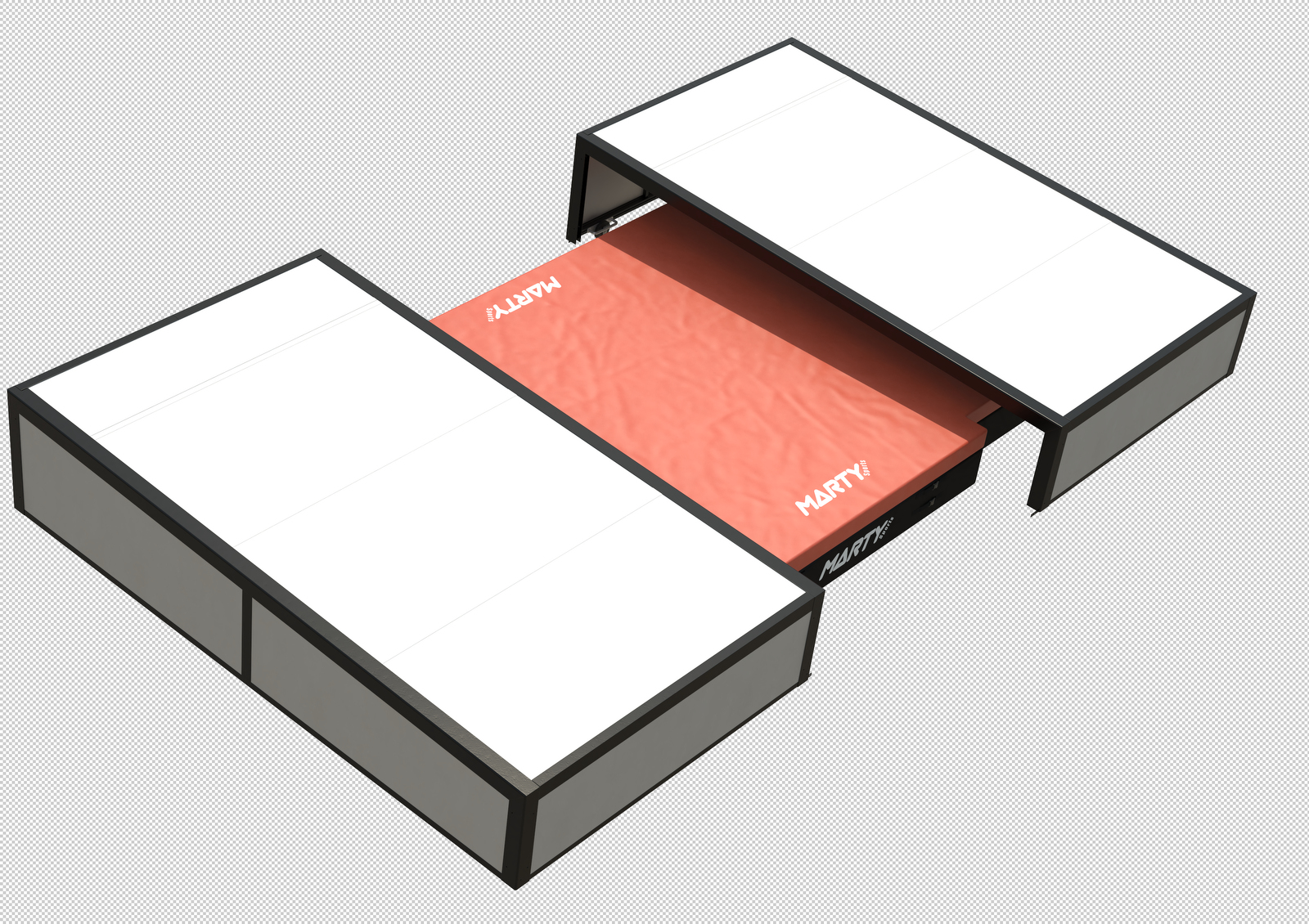 – Toit et côtés constitués par des panneaux en profils SPECIFIQUES MARTY section carré 60mm soudés avec remplissage en tôle aluminium épaisseur 2mm insérée dans une feuillure spécialement adaptée.